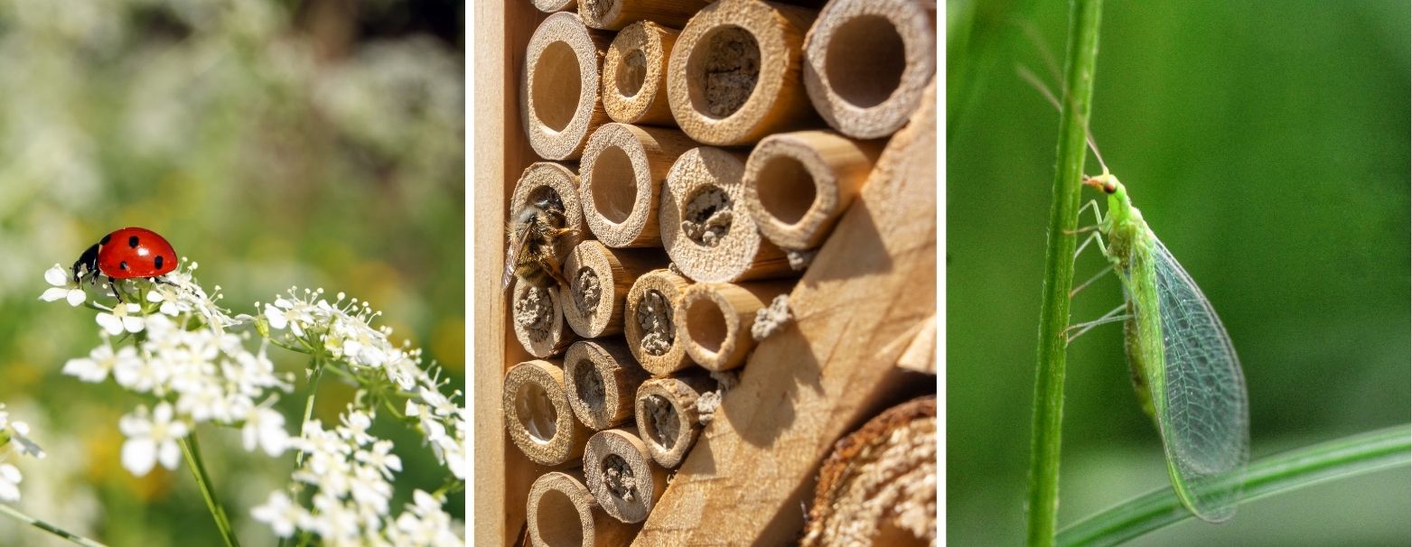 Ein gut ausgestattetes Insektenhotel zieht verschiedene Arten nützlicher Insekten an: