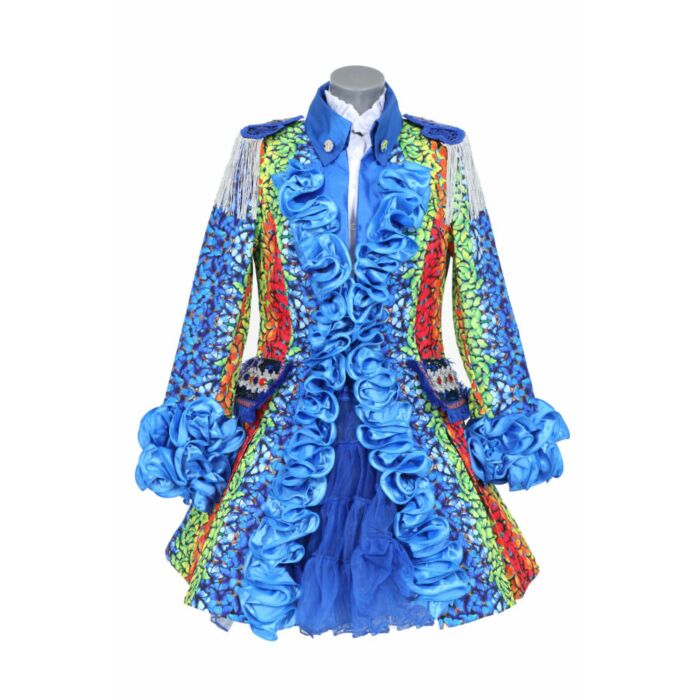 Diese auffällige Butterfly Damenjacke lässt die Energie des Karnevals mit einer Explosion aus Farben, glänzenden Details und reich verzierten Rüschen lebendig werden die jede Bewegung betonen und dem Ganzen einen eleganten und zugleich verspielten Ausdruck verleihen sodass du bei Umzügen Festabenden oder jeder anderen Karnevalsveranstaltung garantiert auffällst. Die markanten blauen Rüschen entlang der Vorderseite und an den Ärmeln sorgen für einen königlichen Look während der farbenfrohe Schmetterlingsprint das Design fröhlich und fantasievoll macht und perfekt zur ausgelassenen Atmosphäre des Karnevals passt womit die Jacke sich mühelos mit verschiedensten Stilrichtungen kombinieren lässt von glamourös bis bunt und fantasievoll. Die dekorativen Schulterfransen geben zusätzliche Struktur und lassen die Jacke sowohl aus der Nähe als auch auf Distanz beeindruckend wirken. Diese Jacke ist ein Fest für sich und ideal für alle die beim Karneval groß auftrumpfen möchten und einen hochwertigen außergewöhnlichen Look suchen. Erhältlich bei Tuincentrum Leurs Venlo wo du alles findest um dein Karnevalsoutfit zu vervollständigen.