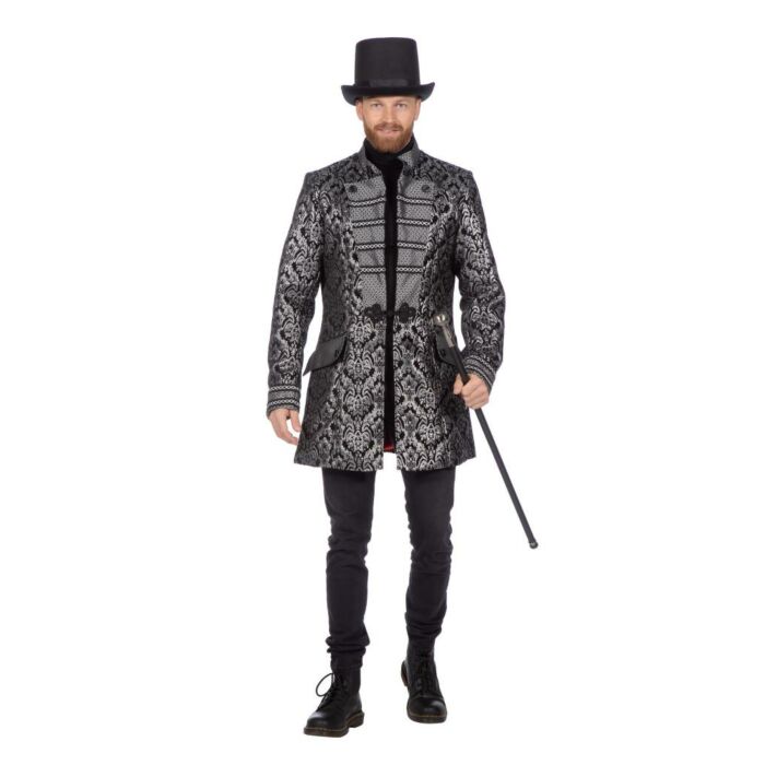 Diese luxuriöse Brokatjacke in Schwarz und Silber ist die perfekte Wahl für ein stilvolles Karnevalsoutfit.